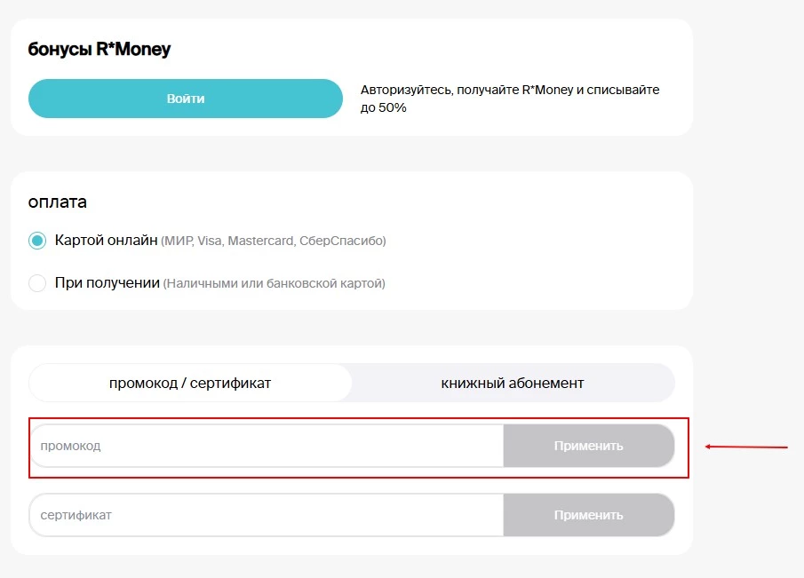 - пользуйтесь подарочными сертификатами, позволяющими оплатить до 100 процентов стоимости выбранной книги или другого товара;